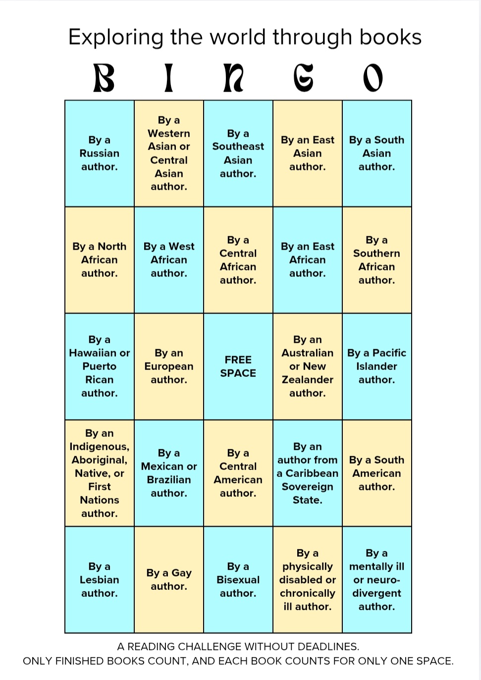 - This bingo focuses on the authors, not where the book is set or who the characters are. Fantasy/Sci-fi, immigrant stories, and anything else counts as long as the author fulfills the square. (Feel free to play it counting only books originally published in the area named in the square if you want, though.)